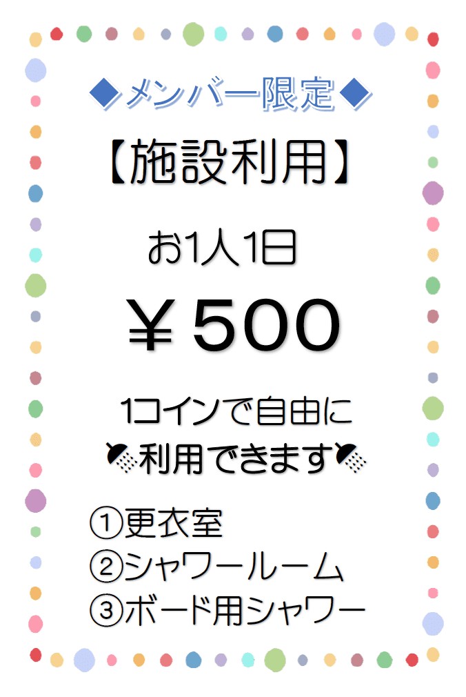 2020.08.27 NSSCクラブ員限定サービス メンバーの方限定の施設利用についてご案内します。 お1人1日¥500!以下がワンコインで自由にご利用いただけます。 ①更衣室②シャワールーム③ボード用シャワー それでは、楽しいSUPライフを!